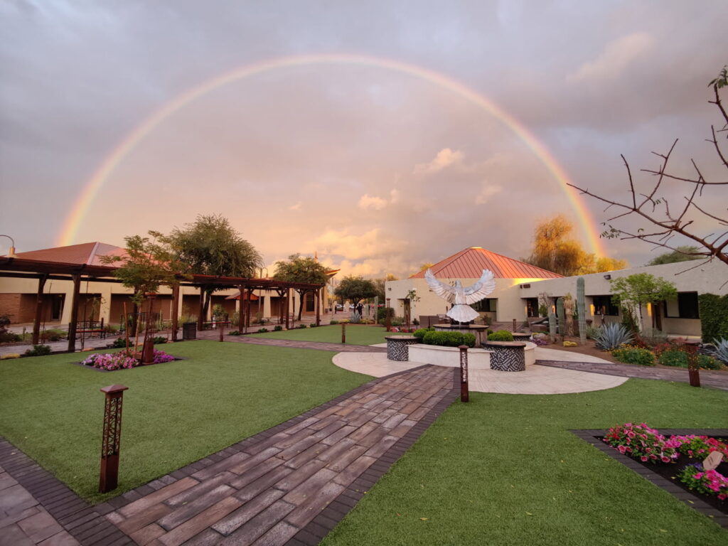 A point in case, the first thing anyone entering our parish grounds notices is the meticulously maintained landscape. It’s well-planned, with a colorful array of desert botanicals and brilliant flowers thoughtfully placed within. There are well-placed seating areas with saintly statues inviting one to prayer and contemplation, and a wishing well containing holy water. Each morning when we arrive for Mass, we observe a volunteer or two spending numerous hours maintaining and manicuring these grounds. Long before we knew their names, their gift of self was evident for the benefit of all.
